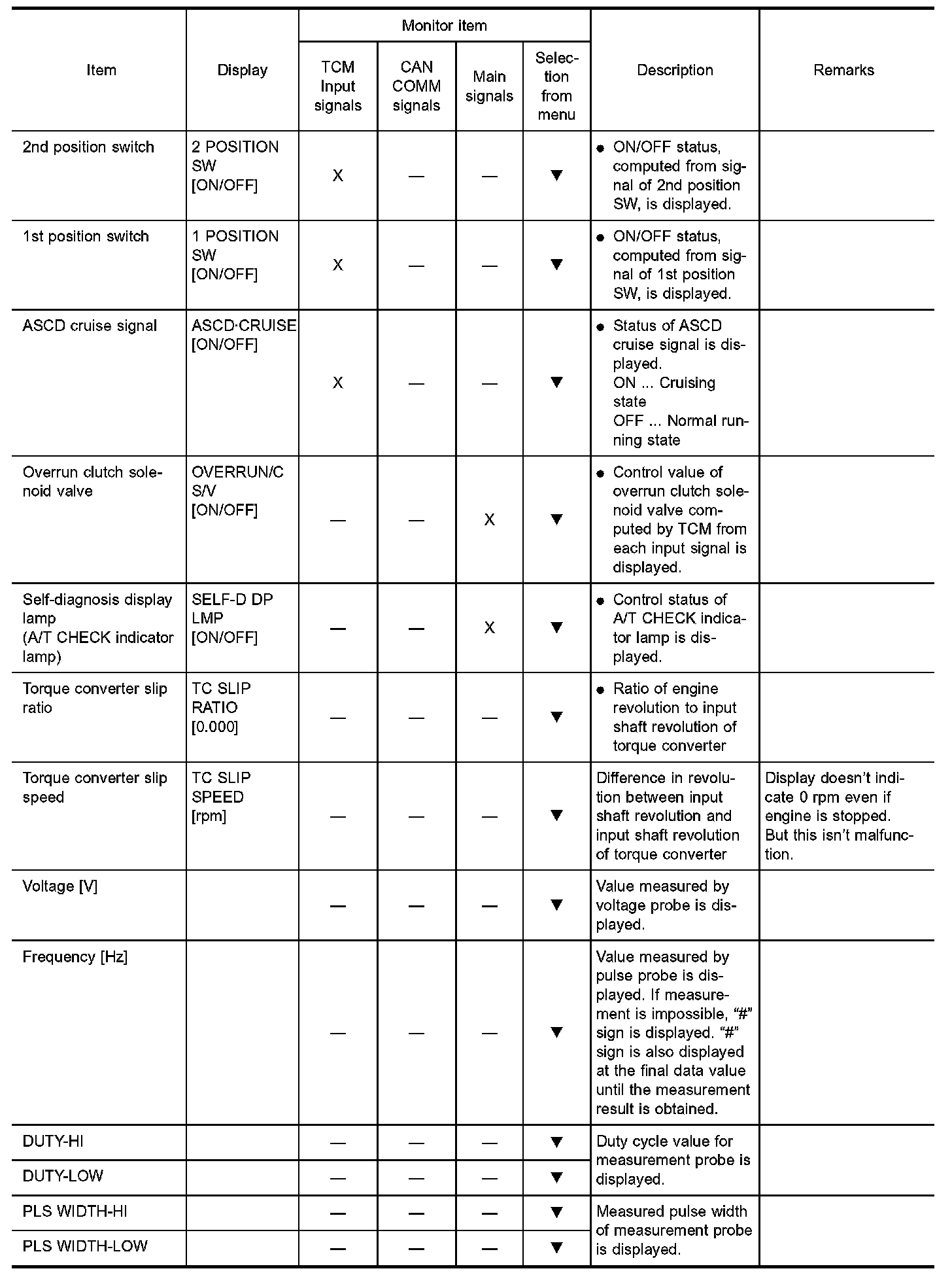 3. Shift solenoid valve "A" or "B" is displayed on CONSULT-II at the start of shifting. Gear position is displayed upon completion of shifting (which is computed by TCM).