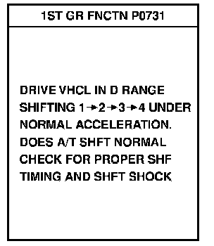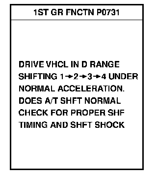 Check for time difference between actual shift timing and the CONSULT-II display. If the difference is noticeable, mechanical parts (except solenoids, sensors, etc.) may be malfunctioning. Check mechanical parts using applicable diagnostic procedures.