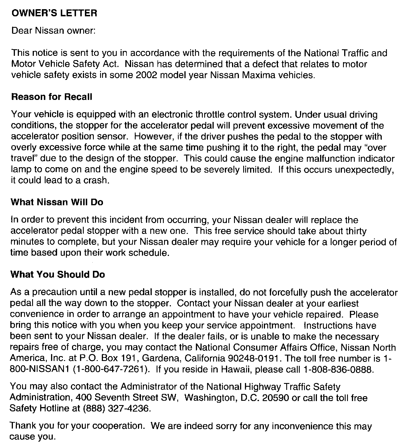 Recall - Accelerator Pedal Stop Replacement