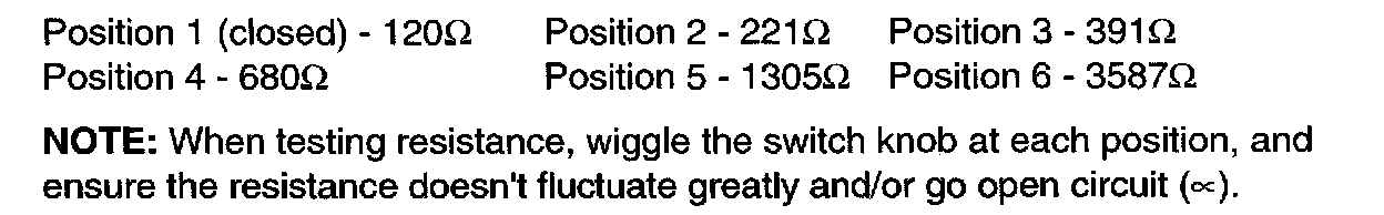 b. After one (1) hour of cold soaking, remove the switch and test all switch position resistances, between the Red (R) wire and Green (G) wire.