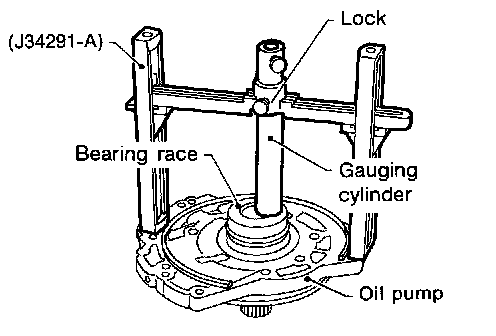 a. With original bearing race installed, place Tool onto oil pump. The long ends of legs should be placed firmly on machined surface of oil pump assembly. The gauging cylinder should rest on top of bearing race. Lock gauging cylinder in place with set screw.