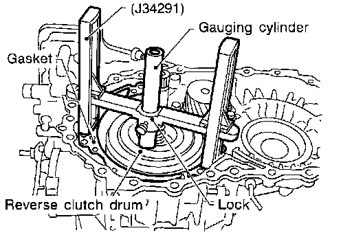 a. Place Tool on machined surface of transmission case (with gasket). Then allow gauging cylinder to rest on reverse clutch drum. Lock cylinder in place with set screw.