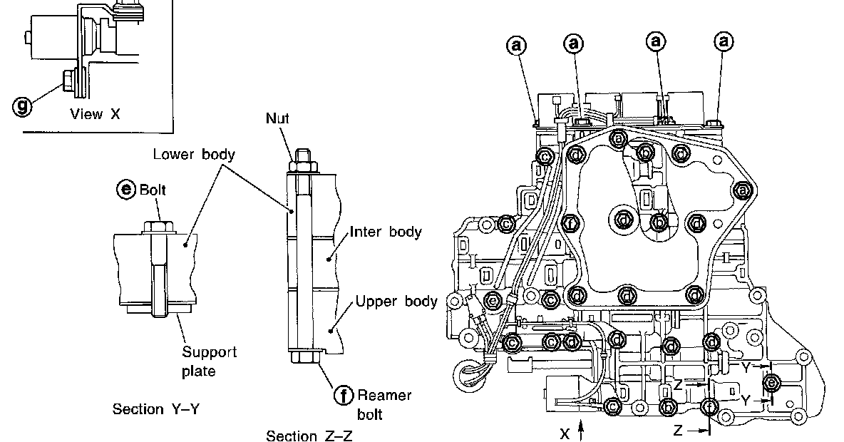 i. Install bolts e from bottom of lower body. Using bolts e as guides, install separating plate and gaskets as a set.