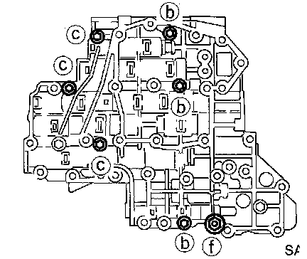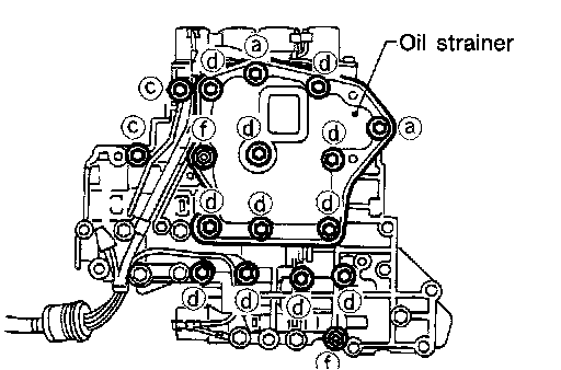 1. Remove bolts a, d and nut f and remove oil strainer from control valve assembly.