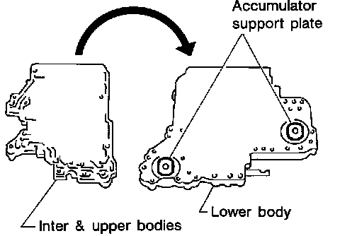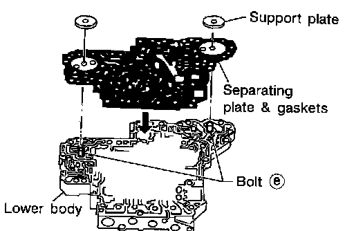 7. Remove bolts e, separating plate and separating gasket from lower body.