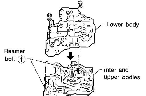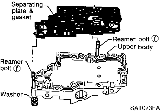 c. Install reamer bolts f from bottom of upper body. Using reamer bolts as guides, install separating plate and gaskets as a set.