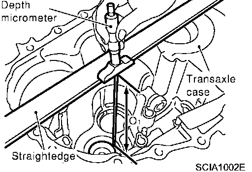 1. Using depth micrometer and straight edge, measure dimension "O1" between transaxle case end face and mounting face of adjusting shim.
