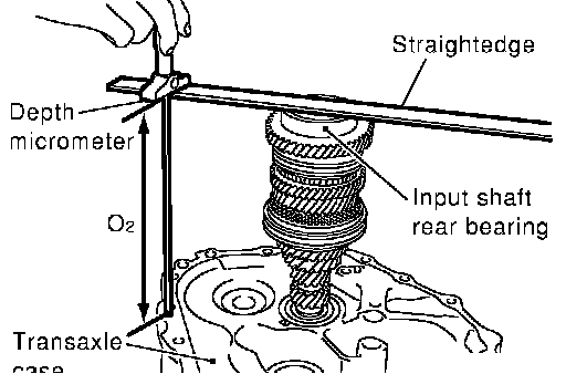 2. Using depth micrometer and straight edge as shown in the figure, measure dimension "O2" between clutch housing case end face and end face of input shaft rear bearing.
