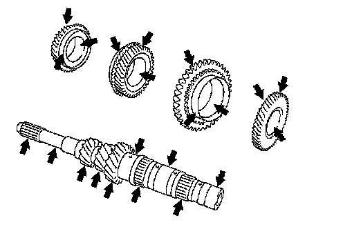 9. Remove 5th bushing, thrust washer, 4th input gear, 4th needle bearing, 4th bushing, 4th baulk ring, 3rd-4th synchronizer hub assembly, 3rd baulk ring and 3rd input gear simultaneously.