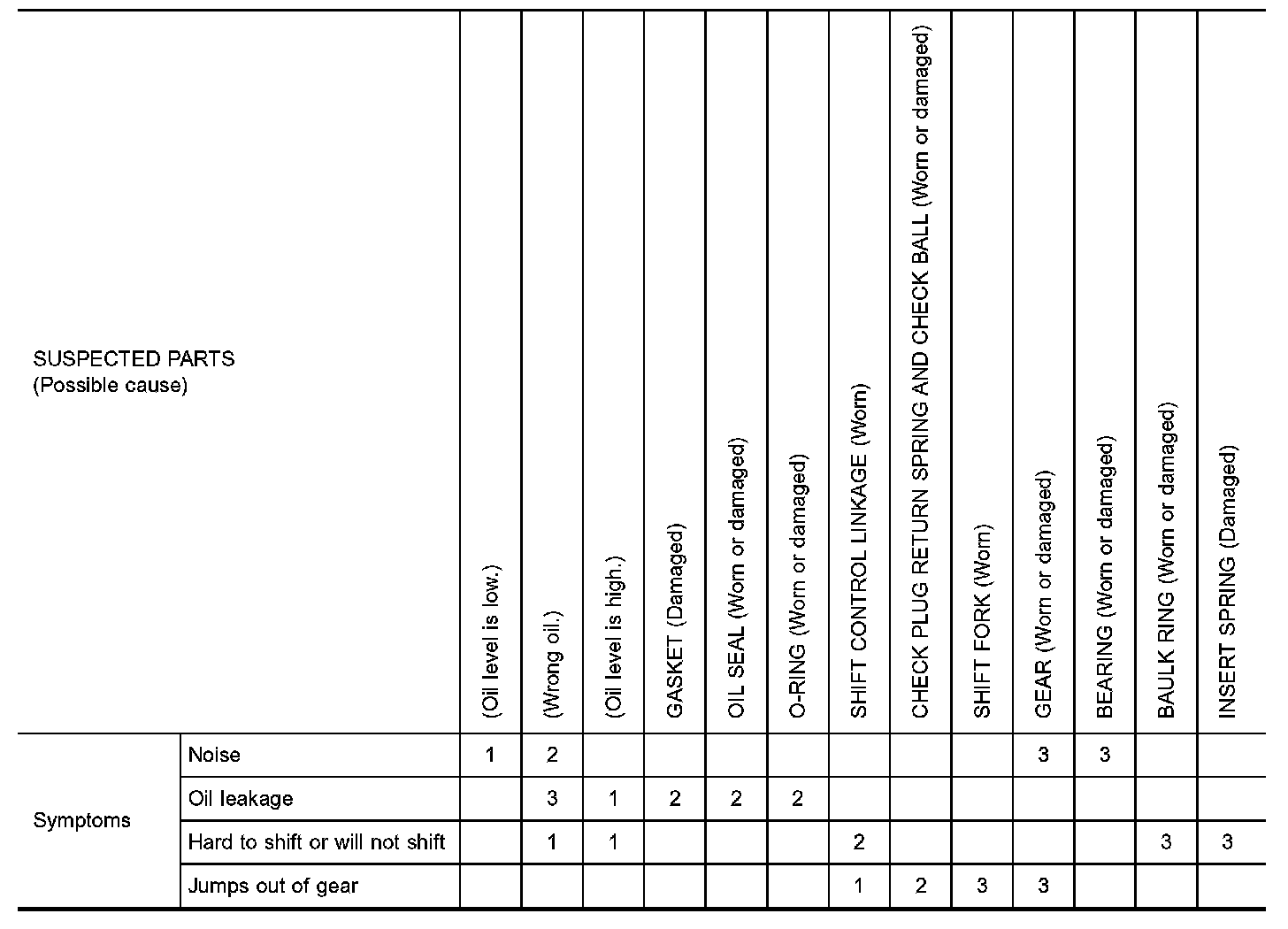 Use the chart below to help you find the cause of the symptom. The numbers indicate the order of the inspection. If necessary, repair or replace these parts.