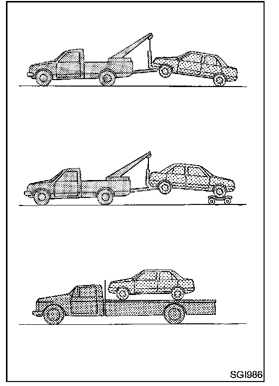 NISSAN recommends that the vehicle be towed with the driving (front) wheels off the ground as illustrated.