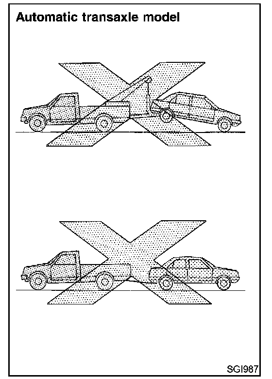 - Never tow an automatic transaxle model with the rear wheels raised and the front wheels on the ground. This may cause serious and expensive damage to the transaxle. If it is necessary to tow the vehicle with the rear wheels raised, always use towing dollies under the front wheels.