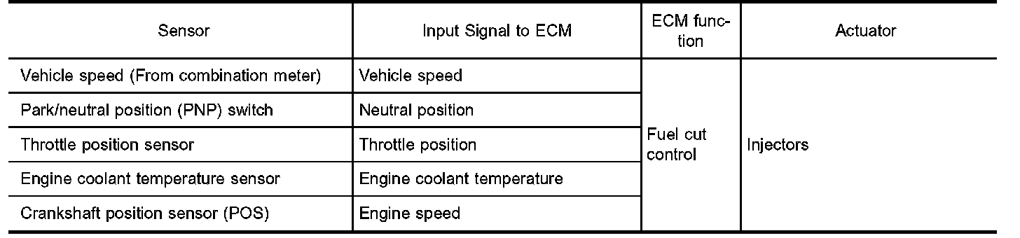 If the engine speed is above 1,800 rpm with no load (for example, in neutral and engine speed over 1,800 rpm) fuel will be cut off after some time. The exact time when the fuel is cut off varies based on engine speed. Fuel cut will operate until the engine speed reaches 1,500 rpm, then fuel cut is cancelled.