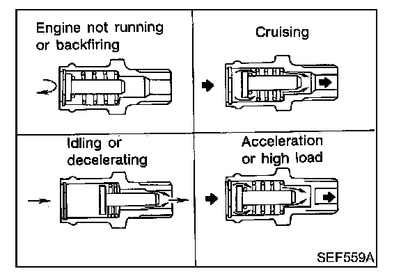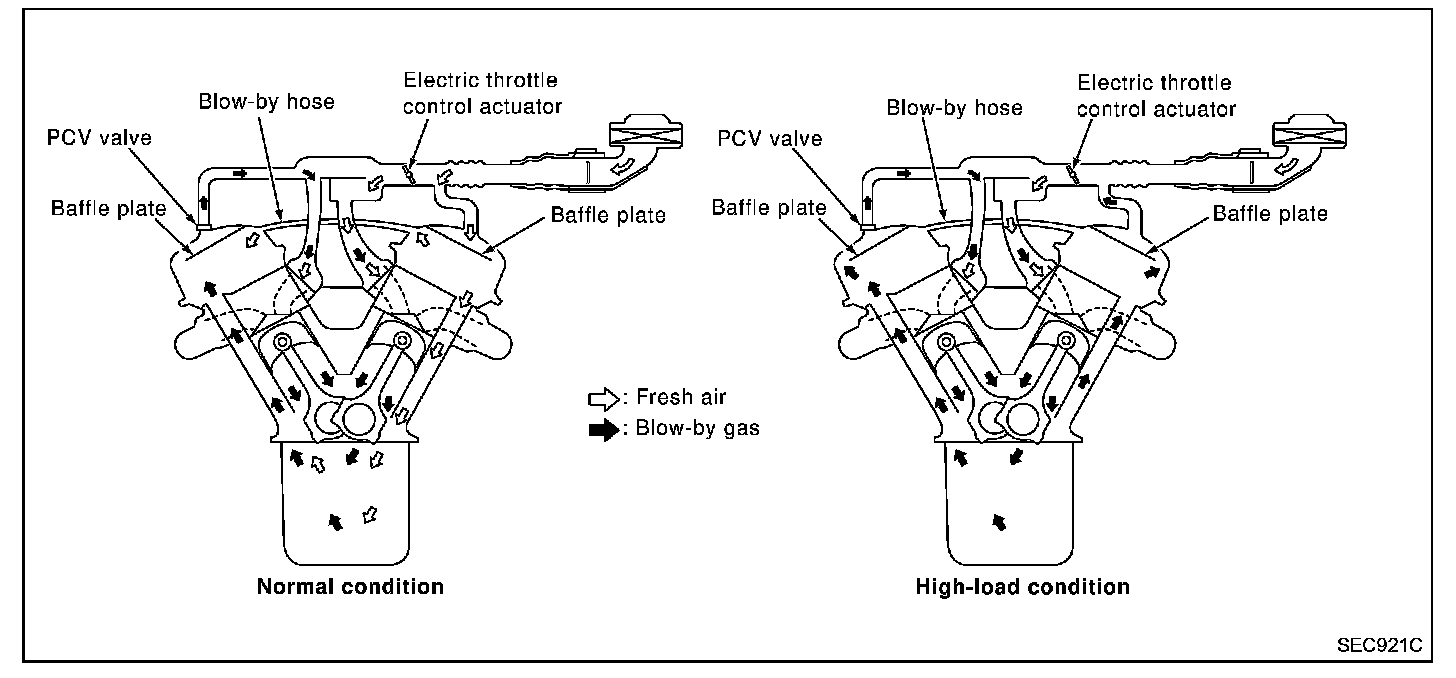 Under full-throttle condition, the manifold vacuum is insufficient to draw the blow-by flow through the valve. The flow goes through the hose connection in the reverse direction.