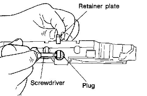 - While pushing plug or return spring, install retainer plate.