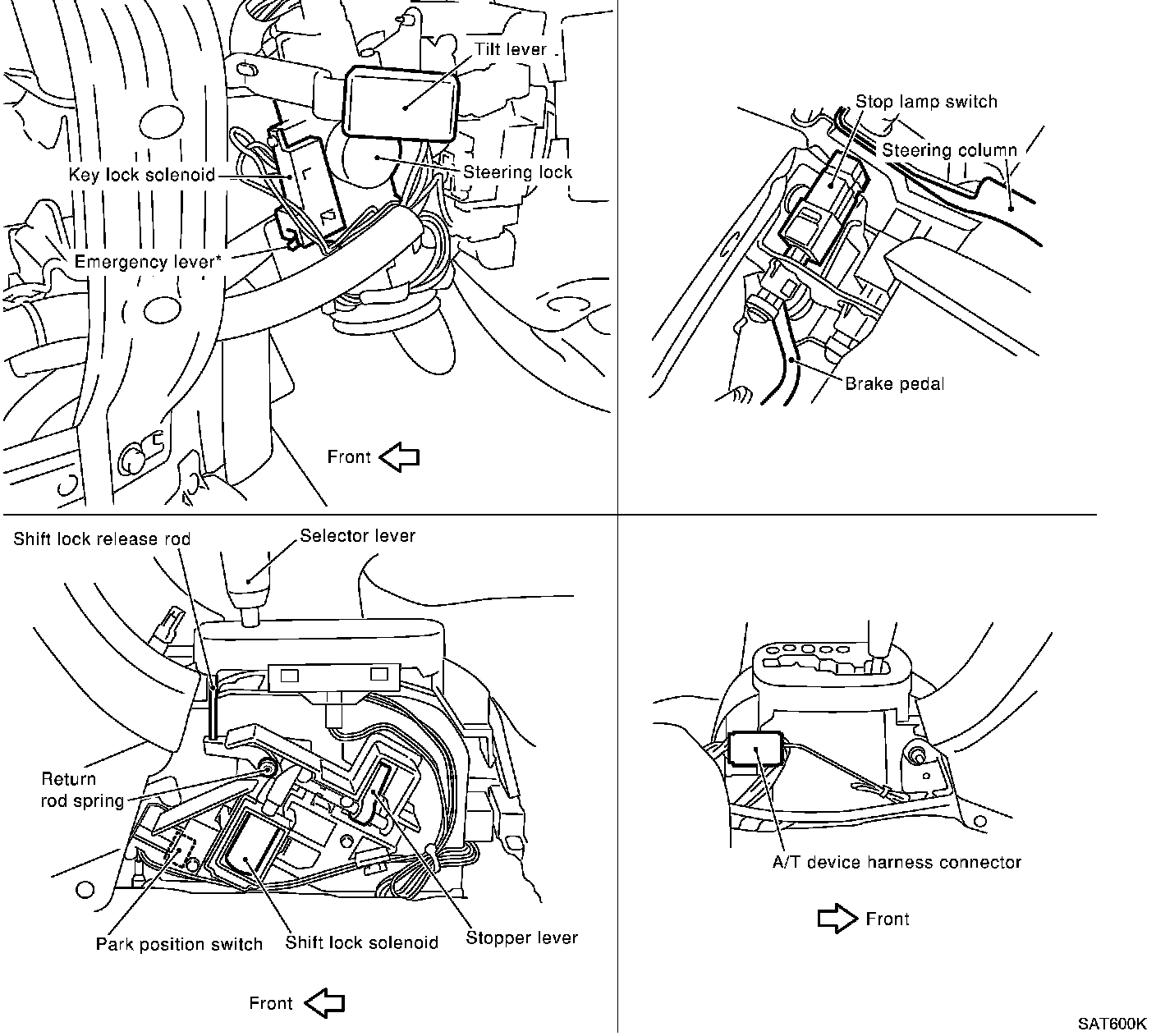 With the key switch turned to ON, the selector lever cannot be shifted from P (parking) to any other position unless the brake pedal is depressed.
