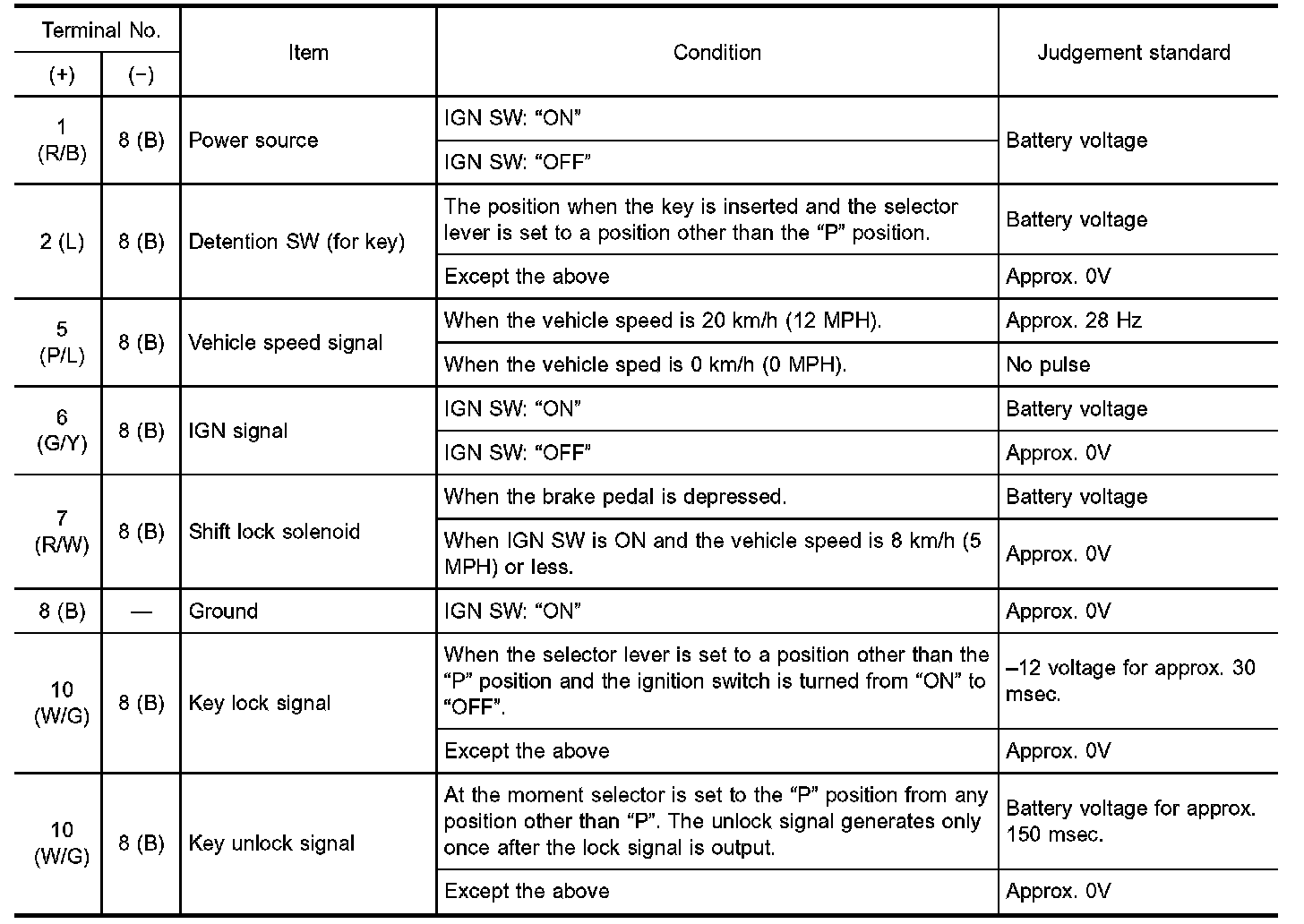 SHIFT LOCK CONTROL UNIT INSPECTION TABLE