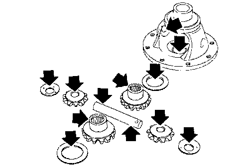 1. Apply gear oil to sliding area of differential case, each gear, and thrust washer.