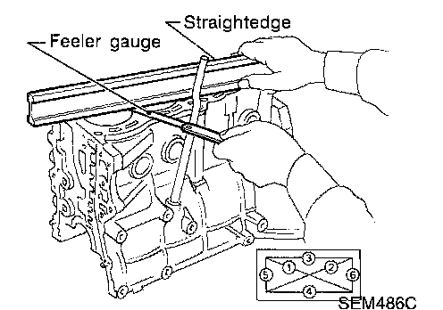 Use a reliable straightedge and feeler gauge to check the flatness of cylinder block surface. Check along six positions shown in figure.