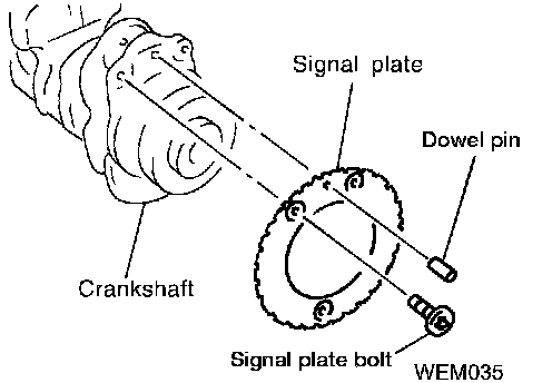 1. Install signal plate to crankshaft using dowel pin to properly position the signal plate. Remove the dowel pin after the signal plate bolts are tightened.