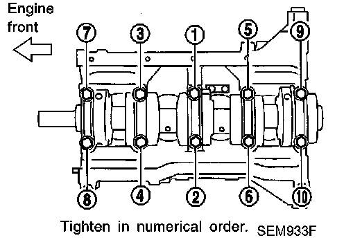 ^ Tighten bearing cap bolts gradually in two or three stages. Start with center bearing and move outward as shown in figure.
