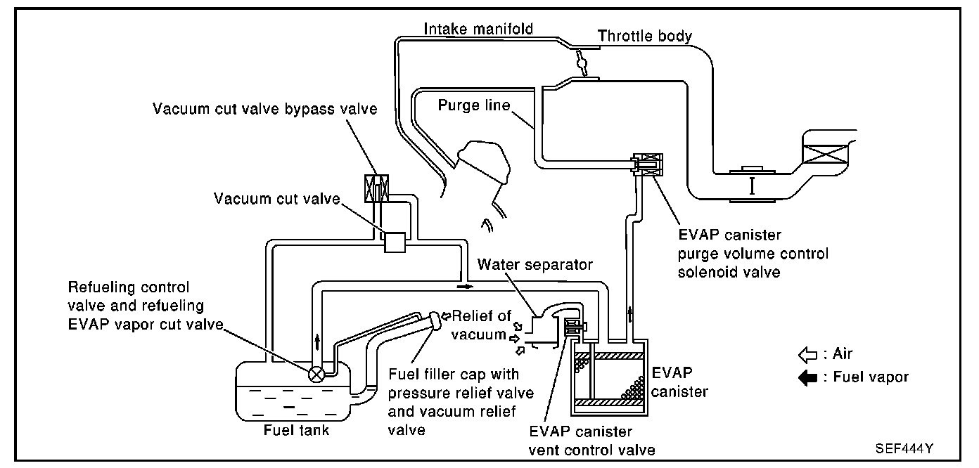 The fuel vapor in the sealed fuel tank is led into the EVAP canister which contains activated carbon and the vapor is stored there when the engine is not operating or when refueling to the fuel tank.