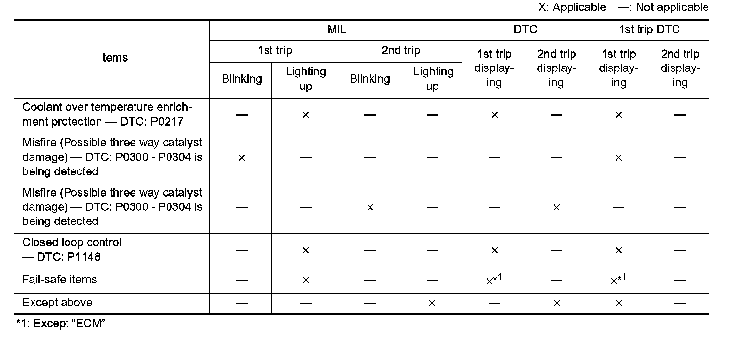 If the same malfunction is detected again during the next drive, the DTC and Freeze Frame data are stored in the ECM memory, and the MIL lights up. The MIL lights up at the same time as when the DTC is stored. <2nd trip> The "trip" in the "Two Trip Detection Logic" means a driving mode in which self-diagnosis is performed during vehicle operation. Specific on board diagnostic items will cause the ECM to light up or blink the MIL, and store DTC and Freeze Frame data, even in the 1st trip, as shown.
