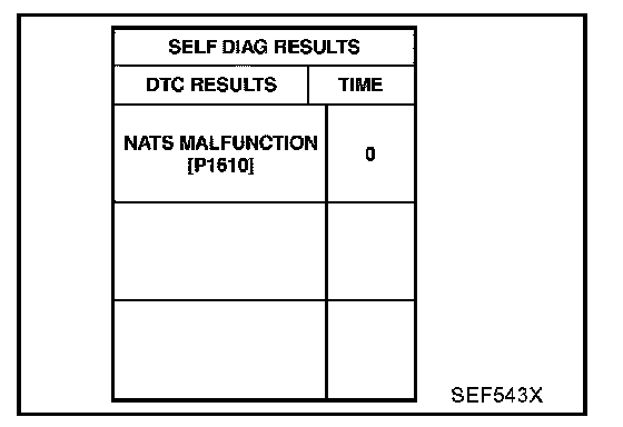 - If the security indicator lights up with the ignition switch in the "ON" position or "NATS MALFUNCTION" is displayed on "SELF-DIAG RESULTS" screen, perform self-diagnostic results mode with CONSULT-II using NATS program card. Refer to "NVIS (NISSAN Vehicle Immobilizer System - NATS)". Antitheft and Alarm Systems