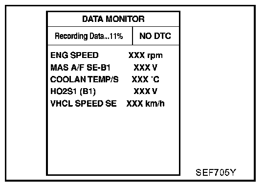 At the moment a malfunction is detected by ECM, "MONITOR" in "DATA MONITOR" screen is changed to "Recording Data... xx%" as shown, and the data after the malfunction detection is recorded. Then when the percentage reached 100%, "REAL-TIME DIAG" screen is displayed. If "STOP" is touched on the screen during " Recording Data... xx%", "REAL-TIME DIAG" screen is also displayed.