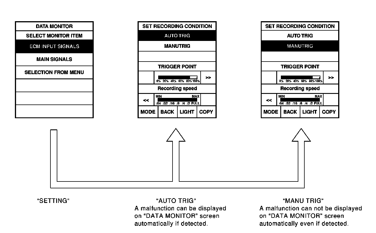 REAL TIME DIAGNOSIS IN DATA MONITOR MODE (RECORDING VEHICLE DATA)CONSULT-II has two kinds of triggers and they can be selected by touching "SETTING" in "DATA MONITOR" mode.