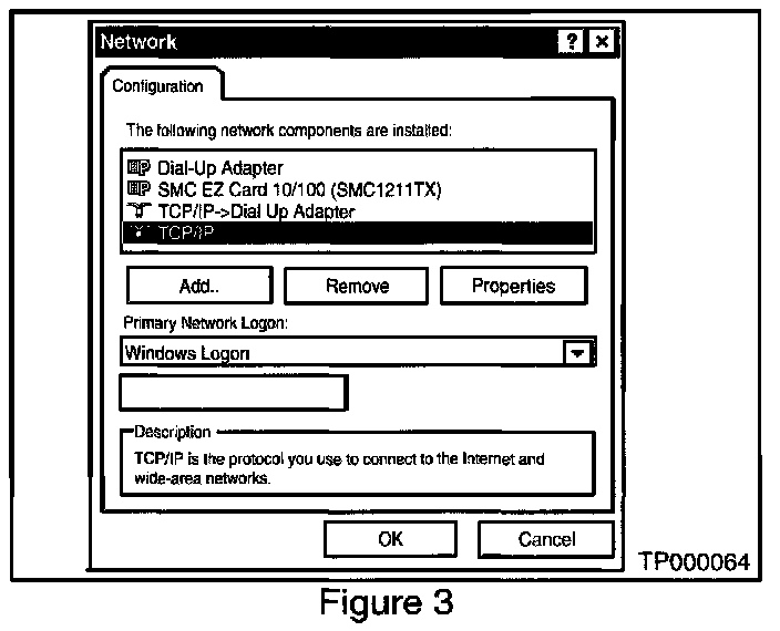 B. When the "Network Configuration" screen appears (see Figure 3) select "TCP/IP". Then select "PROPERTIES".