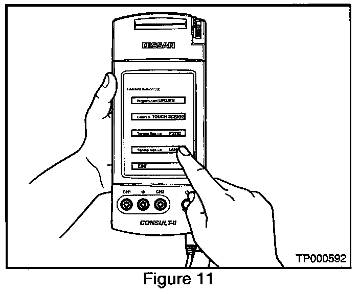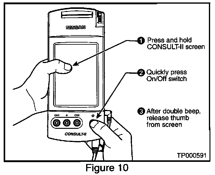 A. While pressing on the CONSULT-II screen with your thumb, quickly depress and release the ON/OFF switch (see Figure 10).
