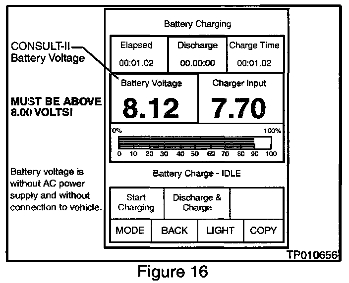 21. After about one minute has passed, check the CONSULT-II's battery voltage reading on the CONSULT-II screen (see Figure 16).