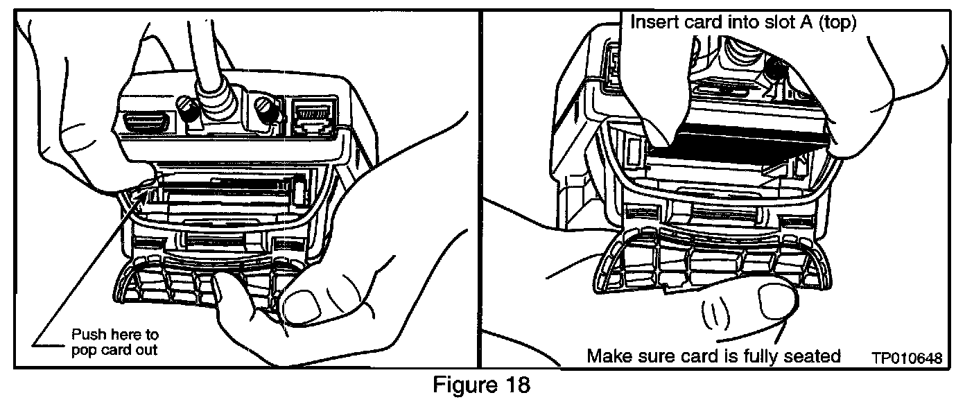 26. Remove the Diagnostics (red/white) card from slot A of CONSULT II and install the ECU Reprogramming card (orange) into slot A (see Figure 18).