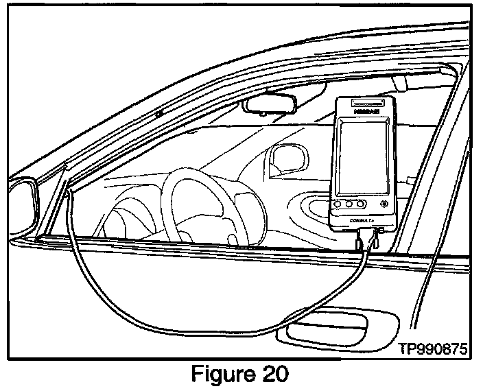 29. Roll down the driver's window part way, exit the vehicle, close the door and hang the CONSULT II unit on the outside of the window (see Figure 20).
