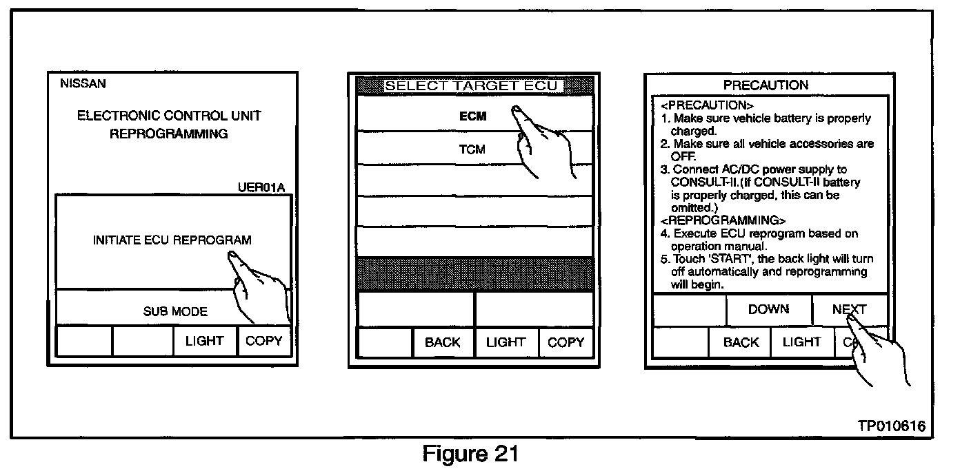 ^ Charge the CONSULT-II battery before proceeding with ECM Reprogramming