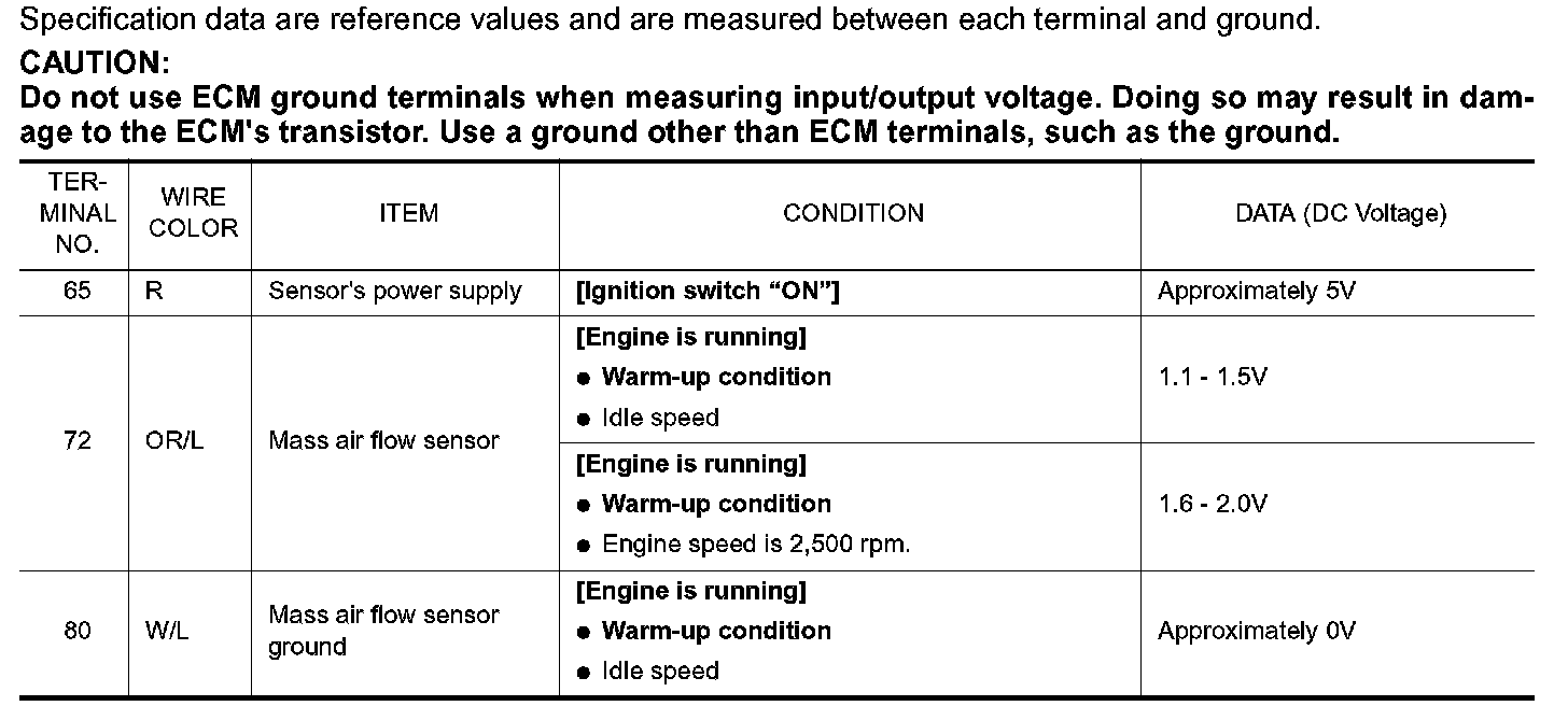 3. Check voltage between ECM terminal 72 (Mass air flow sensor signal) and ground.