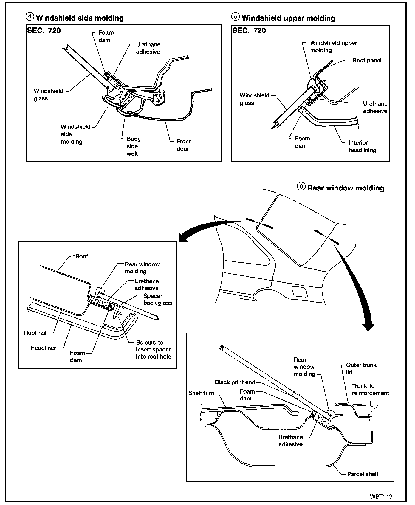 Windshield Side/Upper Molding, Rear Window Molding: