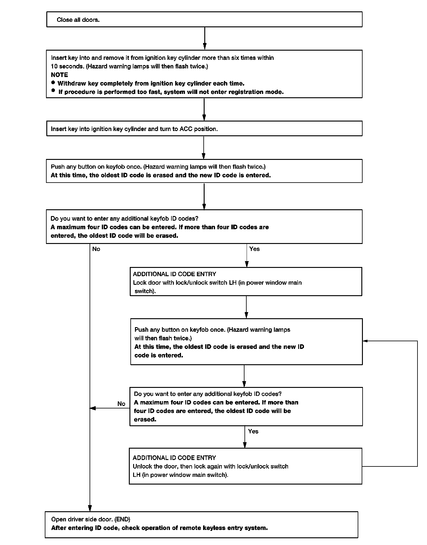 - When registering an additional keyfob, the existing ID codes in memory may or may not be erased. If four ID codes are stored in memory, when an additional code is registered, only the oldest code is erased. If less than four ID codes are stored in memory, when an additional ID code is registered, the new ID code is added and no ID codes are erased.