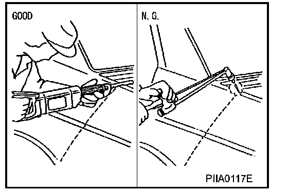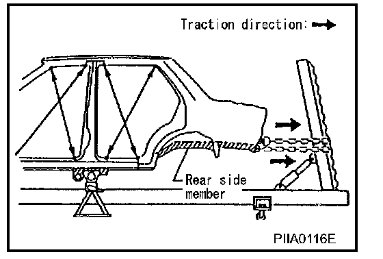 When straightening body panels, use caution in pulling any HSS panel. Because HSS is very strong, pulling may cause deformation in adjacent portions of the body. In this case, increase the number of measuring points, and carefully pull the HSS panel.