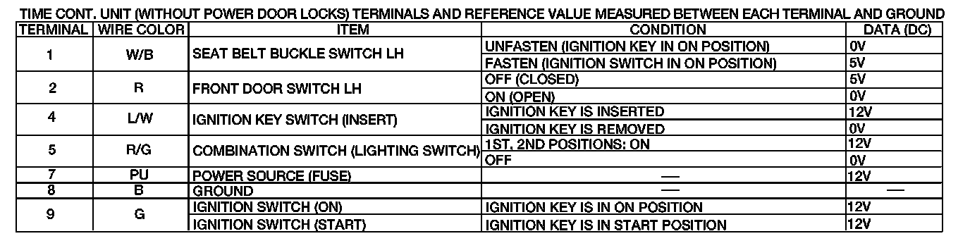 Time Cont. Unit (Without Power Locks) Terminals And Reference Value: