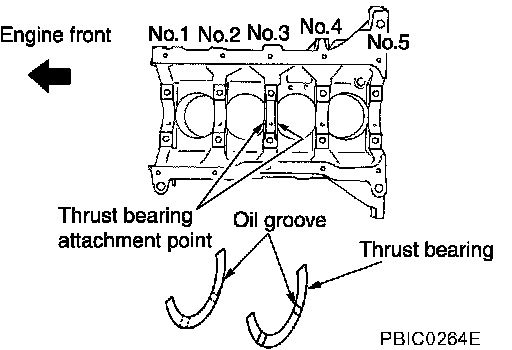 b. Install the thrust bearings to both sides of the No. 3 main bearing journal on the cylinder block.