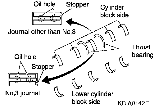 ^ The main bearing with an oil hole and groove goes on the cylinder block. The one without them goes on the lower cylinder block.