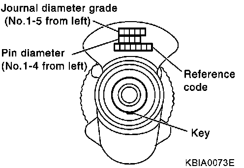 2. Apply pin diameter grade stamped on crankshaft front side to the column in the "Connecting Rod Bearing Selection Table".