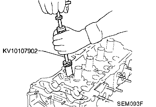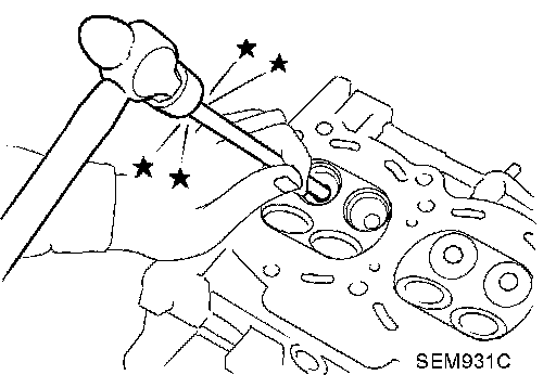 2. Drive out valve guide with a press [under a 20 kN (2.2 ton-force) pressure] or hammer and suitable tool.