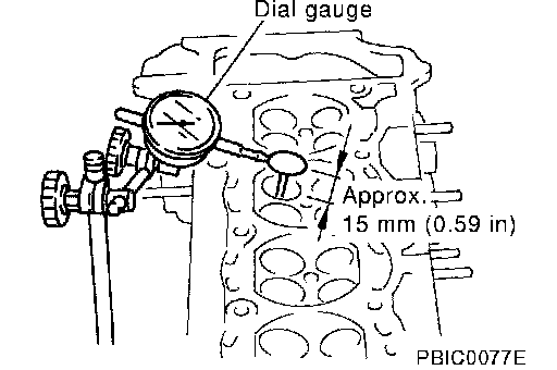 2. Push the valve out by approximately 15 mm (0.59 inch) toward the combustion chamber side to measure the valve's run-out volume (in the direction of dial gauge) with dial gauge.