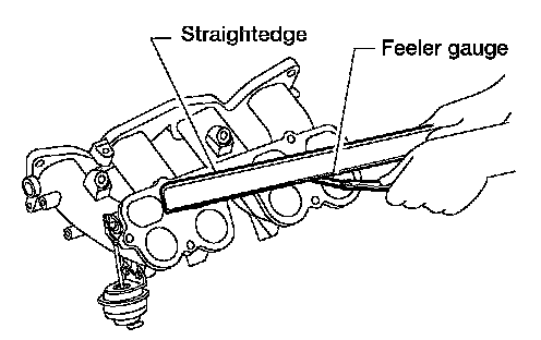 ^ Using straightedge and feeler gauge, inspect surface distortion of intake manifold collector and intake manifold surface.