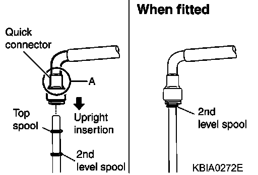 ^ Insert fuel tube into quick connector until the top spool on fuel tubes is inserted completely and the second level spool is positioned slightly below the quick connector bottom end.