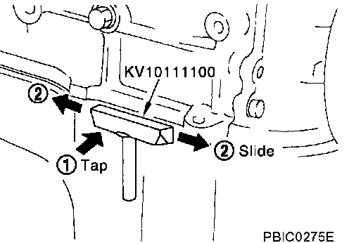 ^ In areas where the cutter is difficult to use, use a plastic hammer to lightly tap the areas where the sealant is applied to disconnect the component.