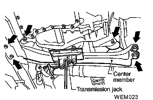 ^ Remove front and rear engine mounting insulator through-bolt and the center member bolts.